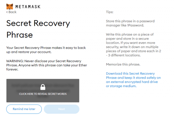 Get Stared dedikten sonra size iki seçenek sunacaktır. Bunlardan ilki yeni bir hesap oluşturmak ve diğeri ise hali hazırda var olan bir cüzdanı geri getirme seçeneği. Biz ilk kez oluşturacağımız için yeni cüzdan oluştur seçeneğine tıklayacağız. Tıkladıktan sonra sizden metamask uygulamasına girerken sizden isteyeceği bir şifre belirlemenizi istiyor. Şifrenizi belirledikten sonra ise karşınıza kurtarma ifadelerinizin olduğu sayfa çıkacaktır.