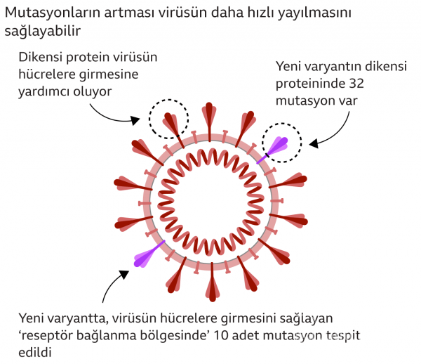 Bilim insanları, Omicron varyantının virüsün vücuttaki hücrelere girişinde kilit rol oynayan spike proteininde çok sayıda farklı mutasyon barındırdığını kaydediyorlar.