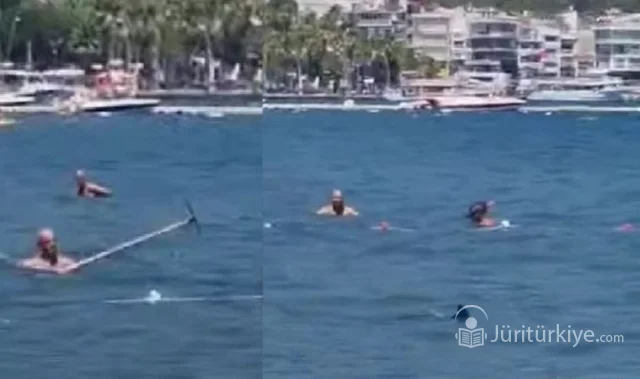 Marmaris Sahilinde yüzme bölgesine kadar yaklaşan köpek balığını Vatandaşlar yer silme paspası ile kafasına vurarak kovdu.